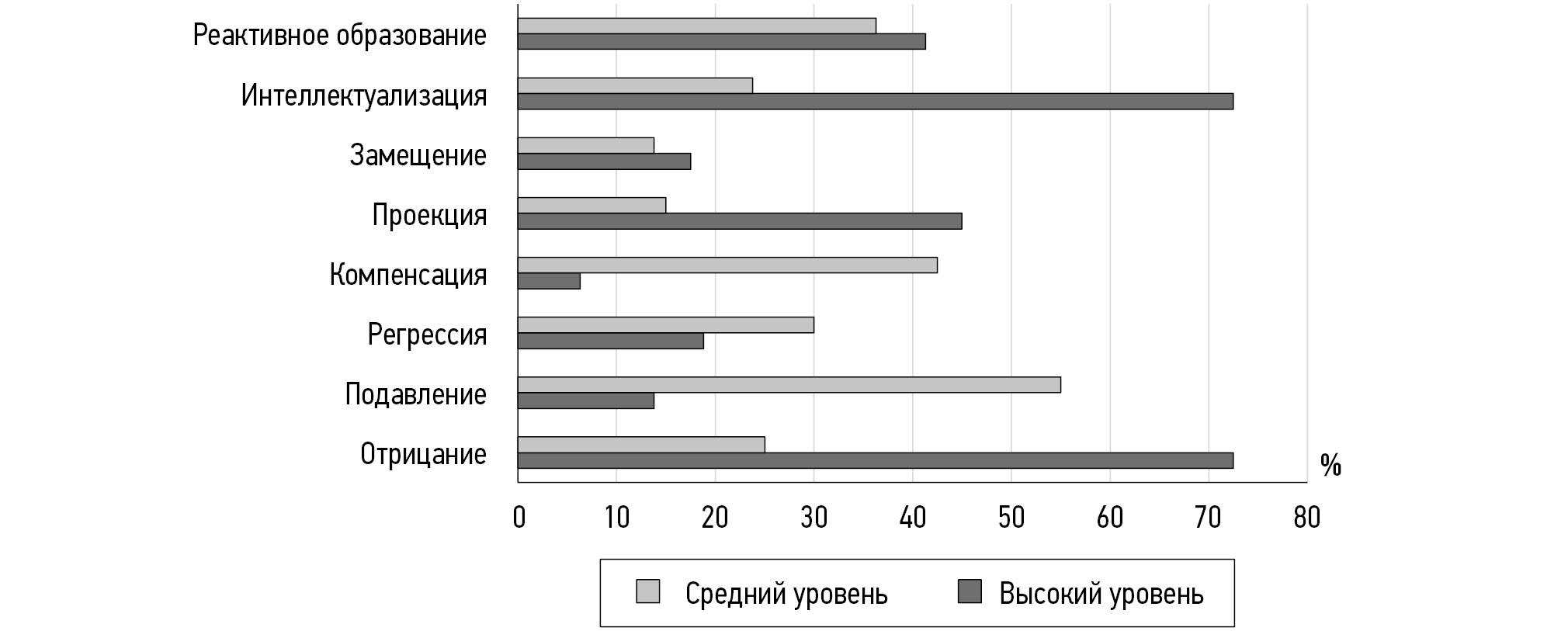 Рис. 1. Частота встречаемости высокого и среднего уровня напряжённости механизмов психологической защиты у пациентов с травматической болезнью спинного мозга.
