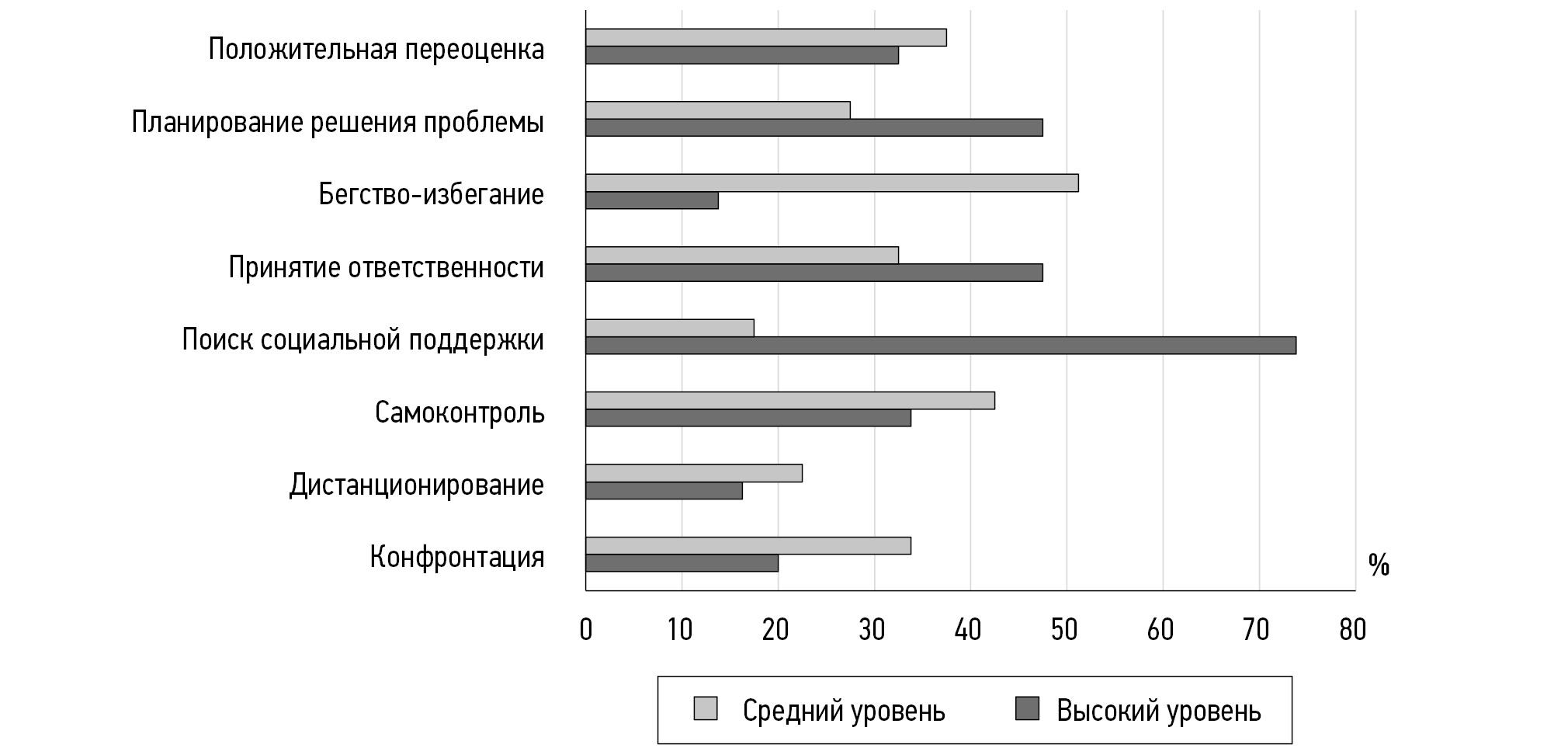 Наиболее используемые пациентами с ТБСМ копинг-стратегии: «поиск социальной поддержки» ― высокий уровень у 59 (73,8%) человек, средний ― у 14 (17,5%); «принятие ответственности» ― у 38 (47,5%) и 26 (32,5%); «планирование решения проблемы» ― у 38 (47,5%) и 22 (27,5%) соответственно (рис. 2).
