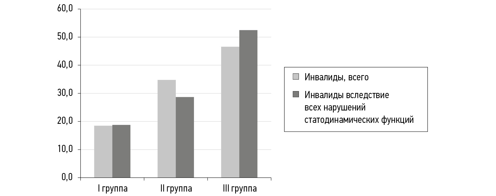 Рис. 6. Распределение впервые признанных инвалидами в целом и с нарушением статодинамической функции по группам инвалидности, %.