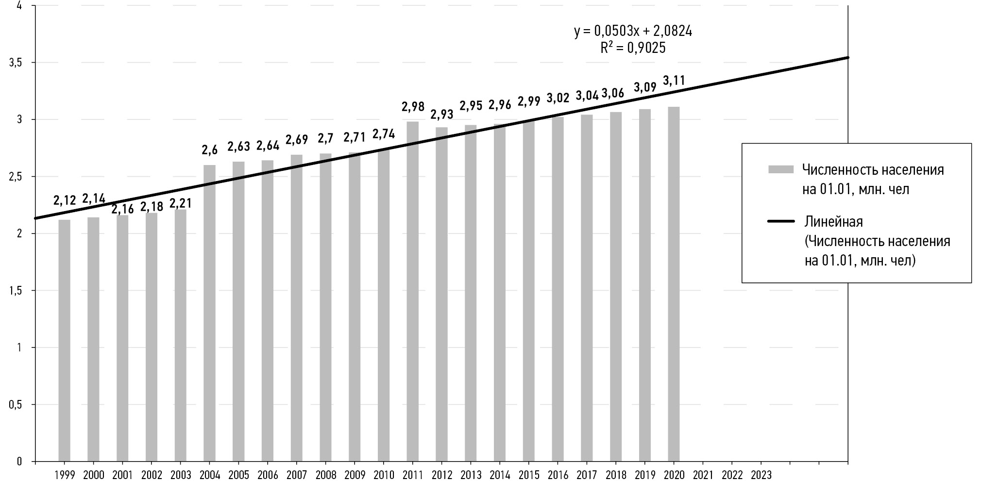 Проведённый анализ показал, что численность населения за изучаемый период увеличилась в 1,5 раза. Установлен неуклонный рост численности населения с 2 120 472 человек в 1999 г. до 3 110 858 человек в 2020 г. при показателе наглядности 146,7% и темпе прироста 0,8 (табл. 1).