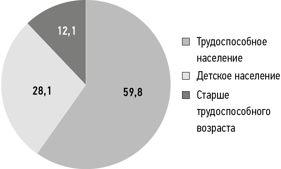 В структуре общей численности населения удельный вес лиц трудоспособного возраста в среднем за 22 года составлял 59,8% (1 619 894 чел.), удельный вес лиц старше трудоспособного возраста ― 12,1% (329 008 чел.); рис. 2.