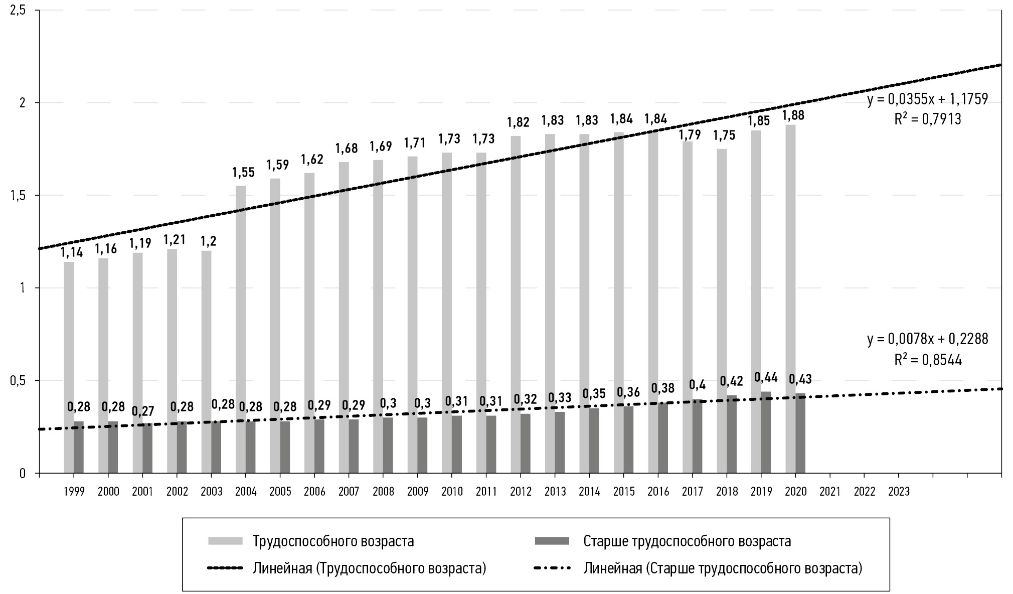 MATERIALS AND METHODS: The study population included individuals of working age and older-than-working age in the Republic of Dagestan. Official data of the territorial body of the Federal State Statistics Service for the Republic of Dagestan were used. Analytical methods, expert assessment methods, and statistical and demographic analyses were employed, which ensured the validity of the research results. A continuous longitudinal study was conducted. When analyzing the trend in the dynamics of the adult population in the Republic of Dagestan (1999–2020), Excel automatically calculated the R2 value, which characterizes the accuracy of the approximation: the closer the R2 value to 1, the more reliably the trend line approximated the process under study. In the study, the R2 value was 0.902.