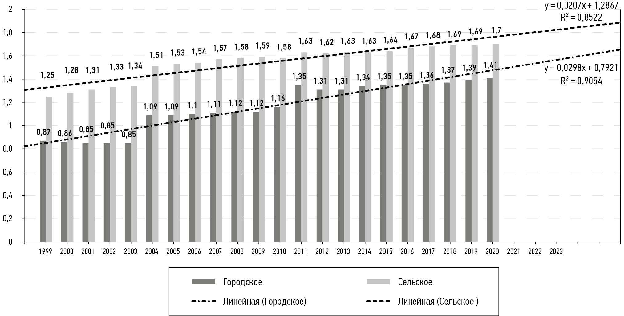 Table 4. Dynamics of the number of urban and rural working-age population in the Republic of Dagestan (1999–2020)