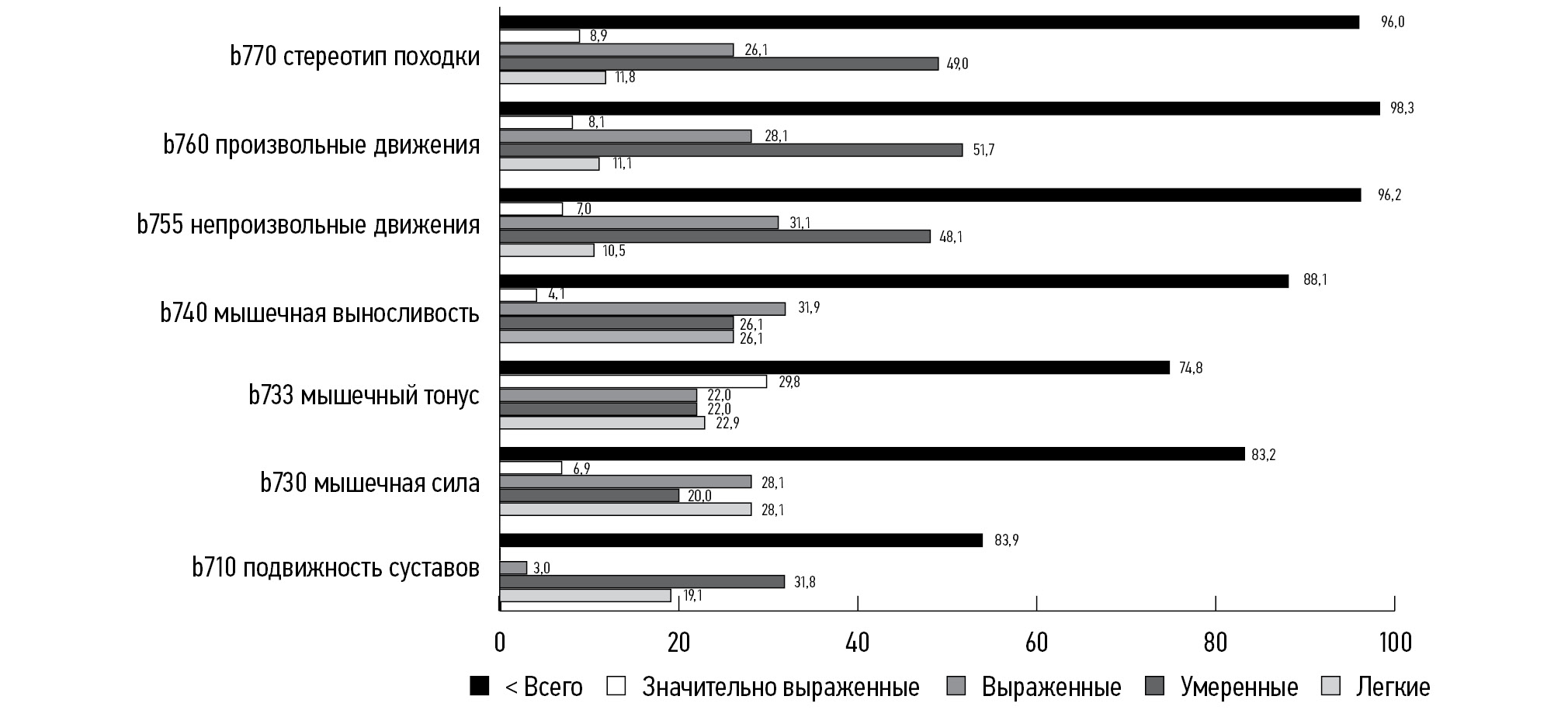 Среди статодинамических нарушений преобладают умеренные, они составляют 56,2%, а у каждого третьего, перенесшего мозговой инсульт и признанного инвалидом в трудоспособном возрасте, наблюдаются выраженные нарушения статодинамических функций организма. Практически у всех инвалидов трудоспособного возраста вследствие ЦИ нарушен контроль произвольных двигательных функций (по домену МКФ b760) разной степени выраженности — в 98,2% случаев, и функции непроизвольной двигательной реакции (по домену МКФ b755) — у 96,2% инвалидов (рис. 1).
