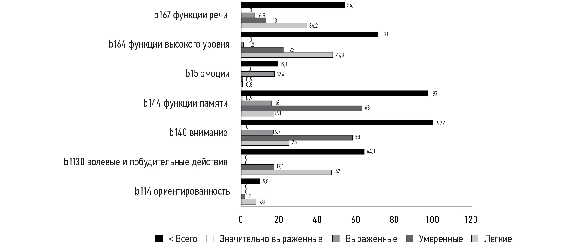 Рис. 2. Оценка нарушений психических функций по МКФ (в %).