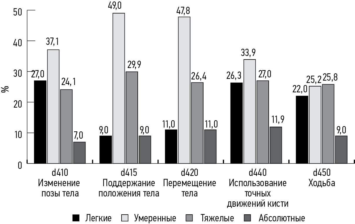 Ограничение мобильности у ВПИ трудоспособного возраста вследствие ЦИ выражается затруднениями при поддержании положения тела (d415) от легкой до значительно выраженной степени у 96,9% инвалидов, затруднениями в изменении позы тела (d410) — у 95%, затруднениями при совершении точных движений кистью (d440) — у 82,9%, затруднениями при ходьбе (d450) — у 82%, затруднениями при перемещении тела (d420) — у 62,9%, соответственно (рис. 3).