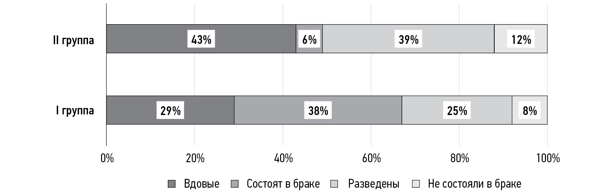 Распределение по семейному положению показало, что во II группе высокий удельный вес имели вдовы (вдовцы) (43,0%) и разведённые (39,0%), доля женатых (замужних) составила 6,0%, никогда не состояли в браке 12,0%. В I группе доля вдовых и разведённых оказалась ниже (29,0 и 25,0% соответственно), доля состоящих в браке — 38,0% и никогда не состоявших в браке — 8,0% (рис. 1).
