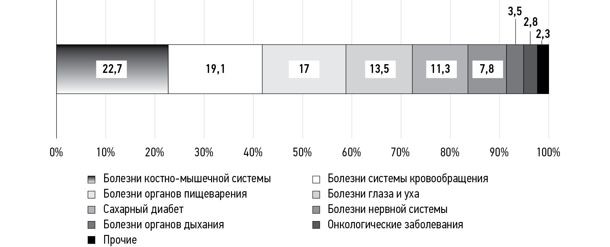 Для пожилых пациентов характерны наличие множественной хронической патологии и развитие ряда гериатрических синдромов [2, 3]. В проведённом исследовании наличие полиморбидности отметил каждый третий респондент (33%), из них 2–3 заболевания имели 26,0%, 4 и более — 7,0%. В структуре заболеваемости 22,7% составляли болезни костно-мышечной системы, 19,1% — сердечно-сосудистой системы, 17,0% — желудочно-кишечного тракта, 13,5% — глаза и уха, 11,3% — сахарный диабет, 7,8% — болезни нервной системы, 3,5% — органов дыхания, 2,8% — онкологические заболевания, 2,3% — прочие заболевания (рис. 2).
