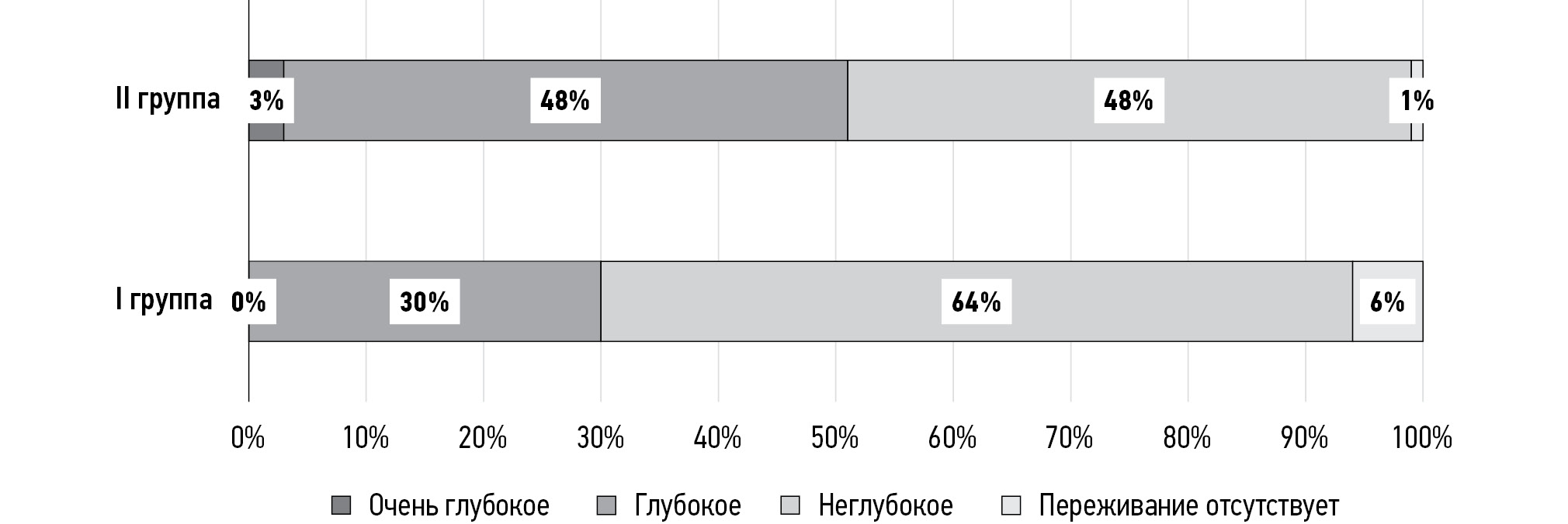 Выявленный высокий удельный вес одиноких лиц в обеих группах респондентов (n=400) послужил основанием для изучения феномена одиночества. Анализ полученных результатов оценки по опроснику «Одиночество» С.Г. Корчагиной свидетельствует о высокой распространённости этого состояния у лиц пожилого и старческого возраста в целом: 94% в группе респондентов, проживающих в домашних условиях (I группа), 99% в группе респондентов, проживающих в геронтологическом центре (II группа). Между группами респондентов выявлены статистически значимые различия по степени проживания состояния одиночества. В частности, очень глубокое переживание не испытывал ни один из респондентов I группы и лишь 3% опрошенных II группы; глубокое переживание испытывали соответственно 30 и 48% (p <0,001), неглубокое переживание одиночества — 64 и 48% (p <0,01). Как видно из представленных данных, переживание состояния одиночества во II группе имело более тяжёлую степень (рис. 4).
