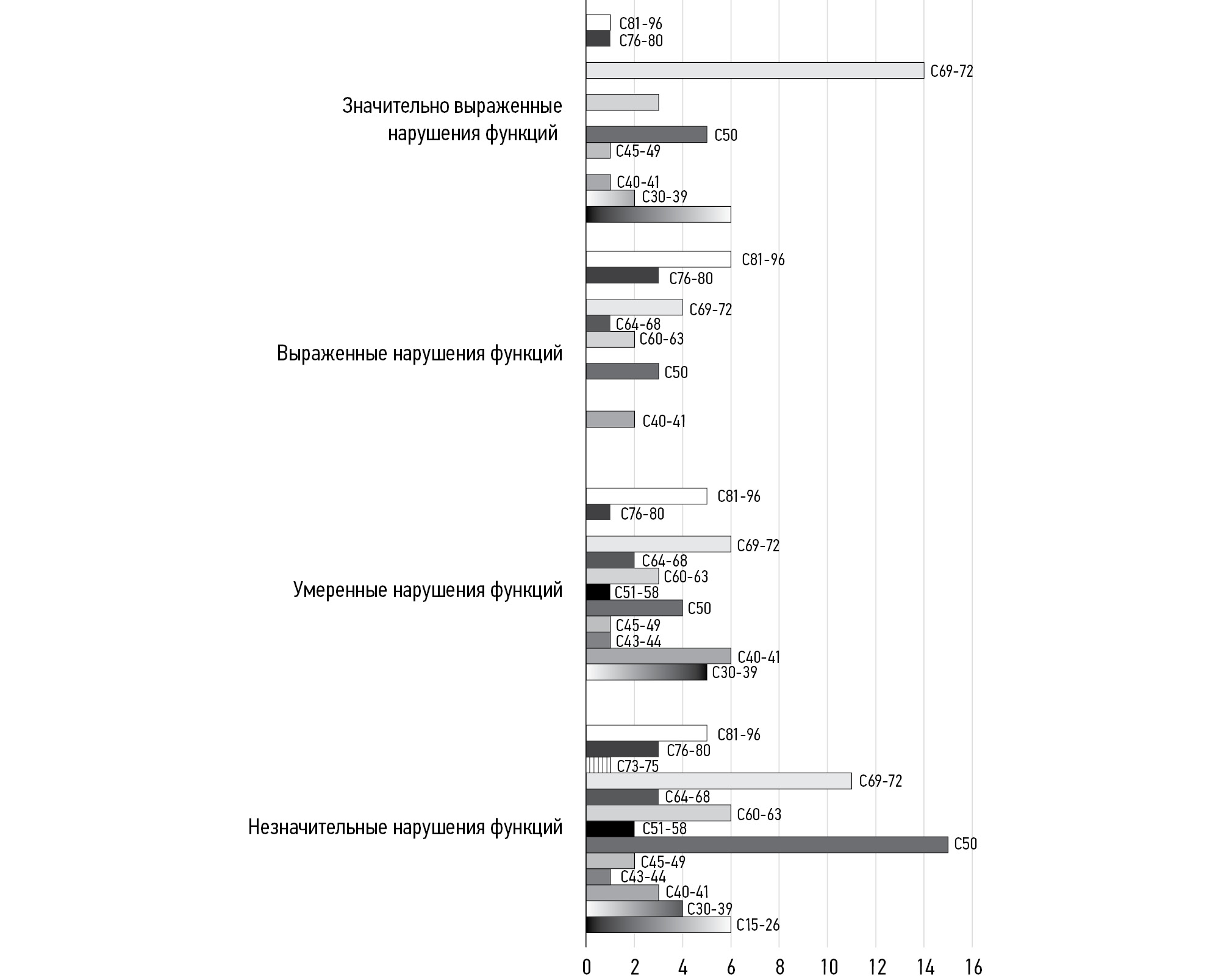 Анализируя осложнения основного заболевания (рис. 2) в виде стойких нарушений статодинамических функций, выявлено, что выраженные и значительно выраженные нарушения встречаются в блоке болезней С70–С72 по МКБ-10, что соответствует новообразованиям головного мозга, мозжечка, спинного мозга. Осложнениями данной группы болезней являлись гемипарезы, стойкий вестибуло-атактический и цефалгический синдромы, симптоматическая эпилепсия, вестибуло-мозжечковая дисфункция, а также вторичный менингит в виде бульбарного синдрома, выраженной вестибулопатии (атаксии ходьбы, координации и равновесия).