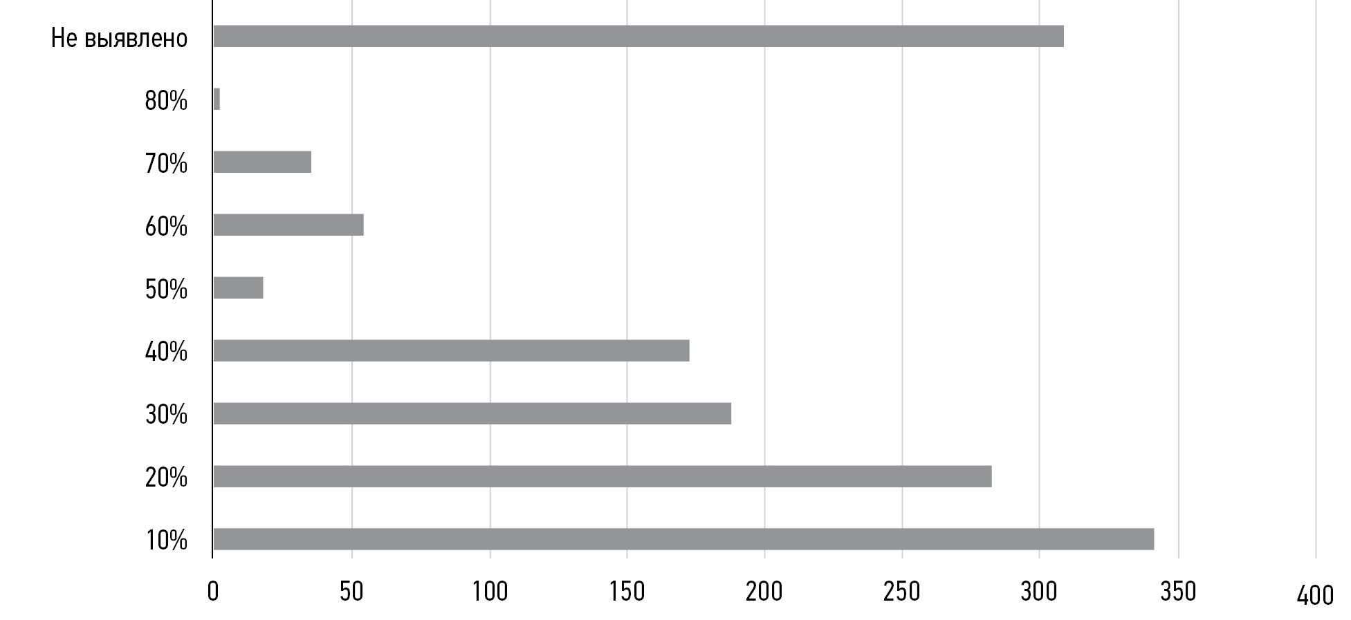 Рис. 1. Анализ степени утраты профессиональной трудоспособности. На оси ординат отмечен процент УПТ, на оси абсцисс — количество пациентов, у которых выявлена УПТ.