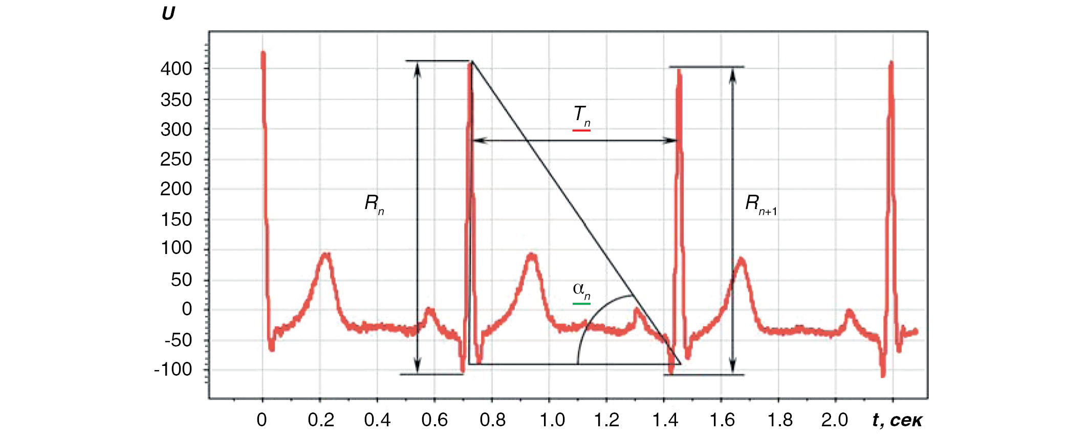 В данной работе используются в основном статистические методы анализа интервалов R-R в силу их простоты, надежности и информативности. Записи ЭКГ 5-минутной длительности обрабатывались с помощью скриптов, написанных на языке программирования Python. После выделения в сигнале R-пиков производились вычисления приращения амплитуды пиков и интервалов между кардиоциклами по формулам (1) и (2):