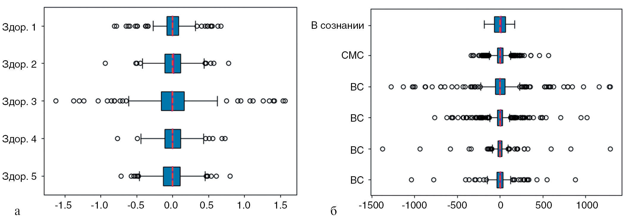 Из рис. 5 видно, что наибольшие значения дисперсии характерны для пациентов в вегетативном состоянии. Для здоровых испытуемых дисперсия близка к нулю. Для пациентов в состоянии минимального сознания разброс значений дисперсии меньше, чем для пациентов в вегетативном состоянии, однако, располагая ограниченным набором данных, эту гипотезу сложно окончательно подтвердить.