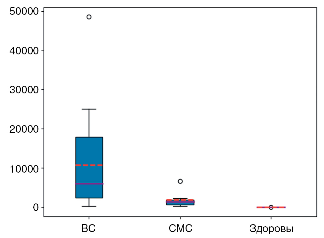 Для всех пациентов основной и контрольной групп были рассчитаны значения дисперсии, коэффициента асимметрии и куртозиса. Разброс значений дисперсии для каждого из пациентов основной группы, находящегося в вегетативном состоянии, состоянии минимального сознания, и здоровых пациентов контрольной группы приведен на рис. 5.