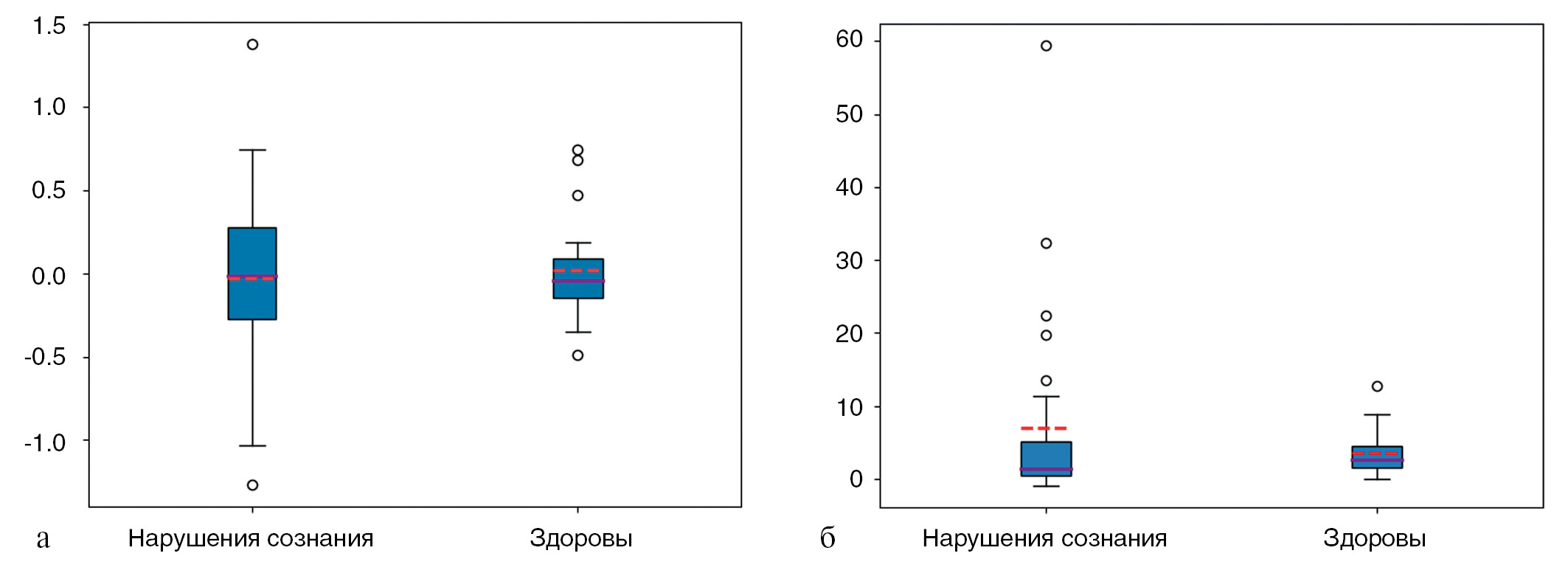 Рис. 6. Диаграммы размаха значений коэффициентов асимметрии (а) и куртозиса (б) для пациентов основной группы и здоровых испытуемых