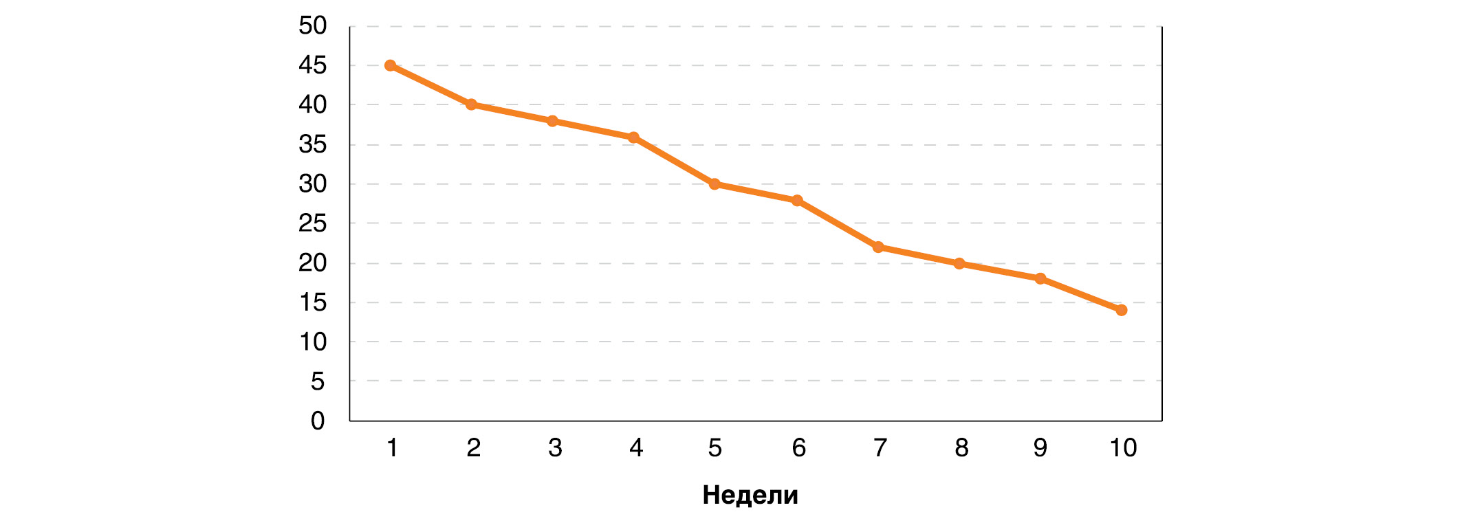 Для оценки заживления пролежня мы использовали адаптированную нами шкалу BWAT [6]. В оригинальной методике BWAT [7] используются 13 объективных критериев раны (размер, глубина, края, карманы, вид некротической ткани, площадь некротических тканей, вид экссудата, количество экссудата, цвет кожи вокруг раны, периферический отёк тканей, уплотнение периферических тканей, грануляции, эпителизация), при этом чем меньше сумма баллов, тем лучшим считается прогноз для заживления декубитальной язвы. Для оценки динамики заживления декубитальных язв использовалась разработанная на основе шкалы Бейтс-Дженсен графическая модель S.Y.R. [6], в которой на оси Y отражаются баллы по шкале Бейтс-Дженсен с шагом 5 единиц, а на оси Х ― временной интервал с шагом 7 дней; дополнительно в модификацию введены такие критерии, как выраженность нутритивной недостаточности и ультразвуковое исследование раны. Точки на графике сопоставлялись 1 раз в 7 дней (рис.).