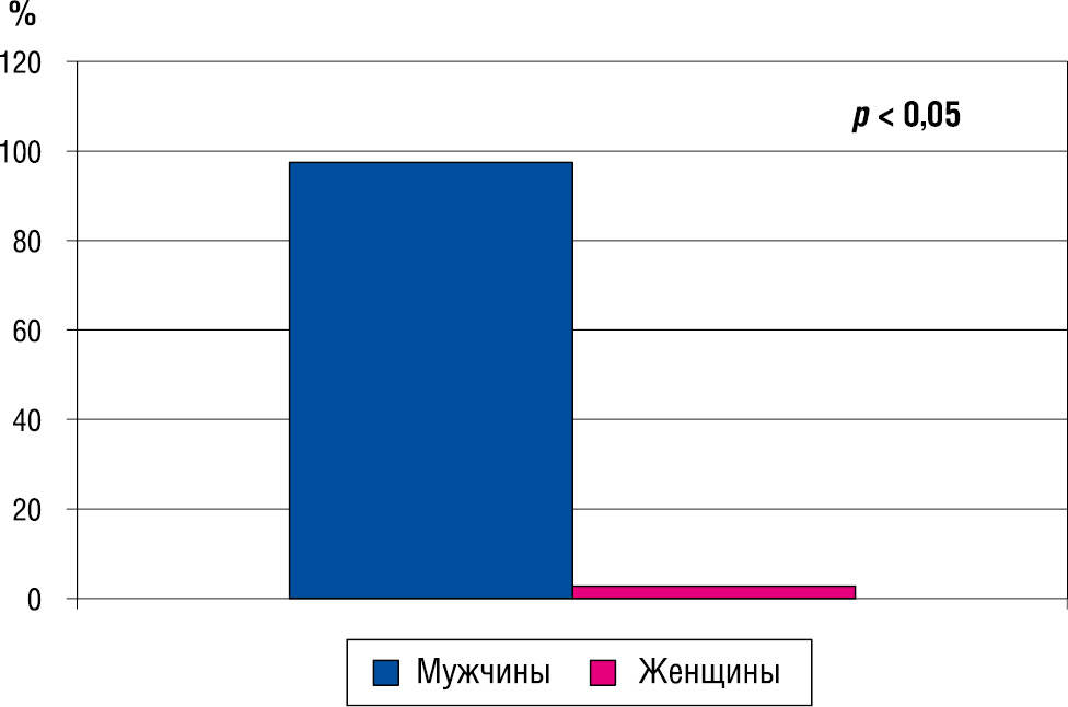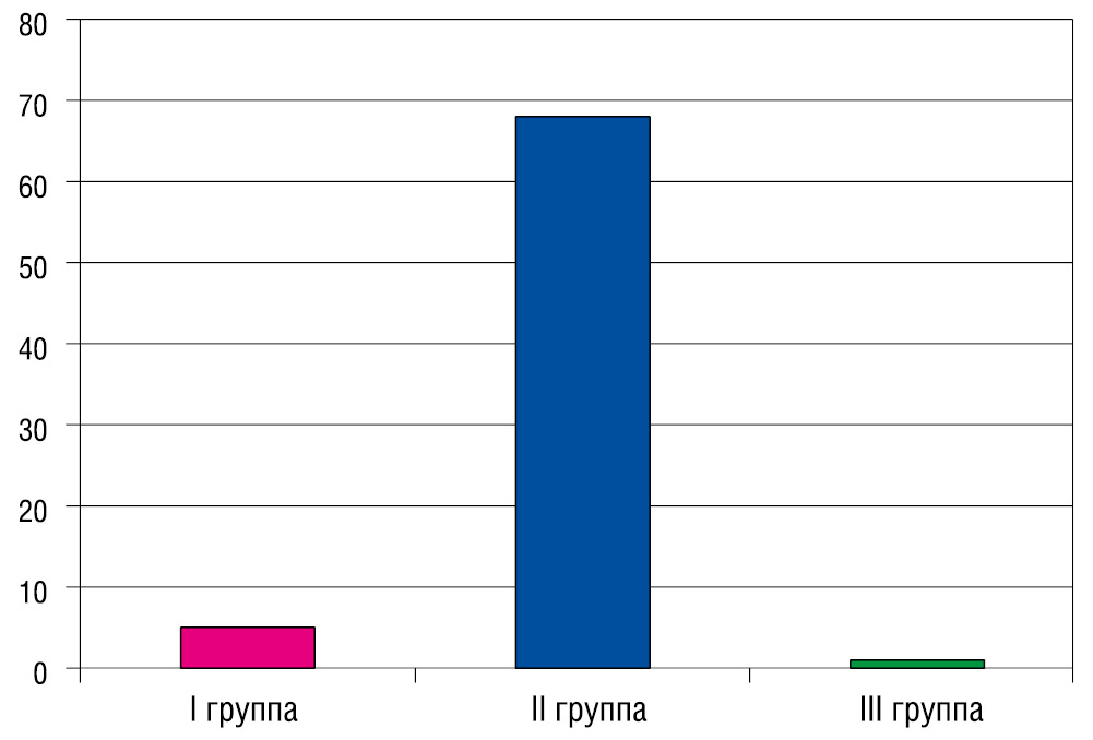 Итак, как видно на диаграмме, большинство больных (64; 73,6%) имели II группу инвалидности, остальные (23; 26,4%) — III группу.