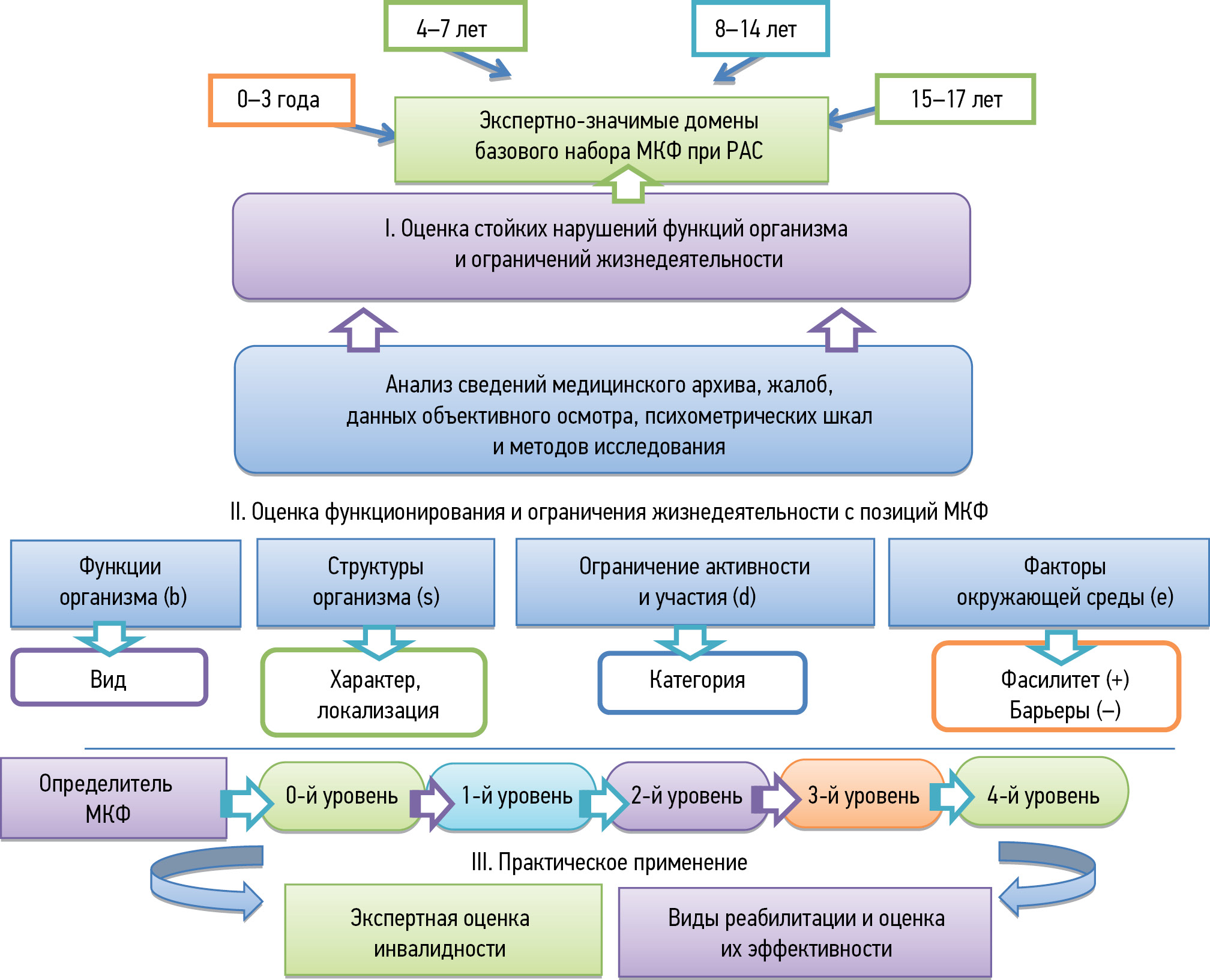 RESULTS: Data on functioning and life activity limitations of children with autism-related disability were analyzed taking into account the clinical form of autism, age of the child (0–3, 4–7, 8–14, and 15–17 years), and presence of comorbid symptomatology according to the ICD-10 criteria (1992) and IFC domains (2001). The main predictors of the severity of autism manifestations were identified depending on the age of the child: 0–3 years, rates of psychomotor and speech development in epicrisis terms; 4–17 years, degree of deficit of social communication/social interaction; and assessment of limited stereotypical forms of behavior. In children aged >3 years, comorbid symptomatology was also assessed, taking into account the use of psychometric scales and research methods approved in the Russian Federation. Predictors of autism severity were translated into expertly significant domains of the basic set of the ICF for ASDs. Quantitative assessment was performed in a unified format using ICF qualifiers comparable to the system of quantitative assessment adopted in medical and social expertise.