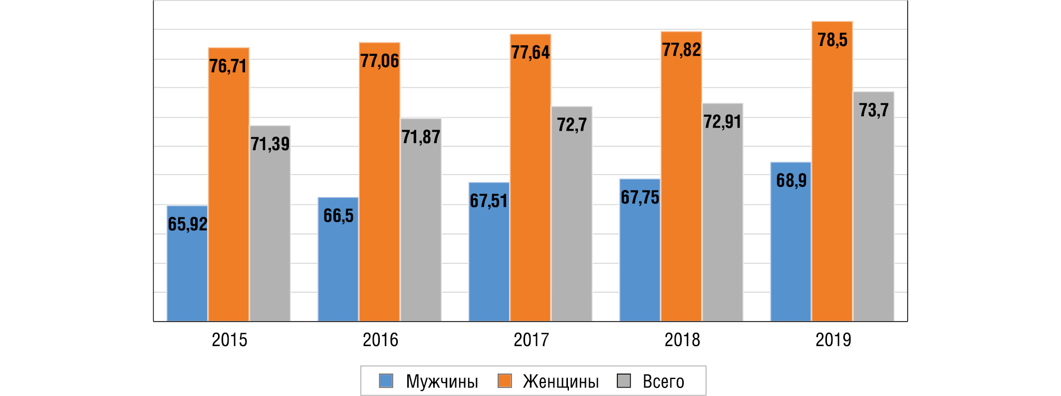 В последние годы благодаря проводимым мерам по улучшению доступности и качества медицинской помощи увеличилась ожидаемая продолжительность жизни граждан Российской Федерации. Так, в 2019 г. ожидаемая продолжительность жизни составила 73,4 года для мужчин и женщин. В среднем мужчины живут на 9 лет меньше женщин (рис. 2) [8].
