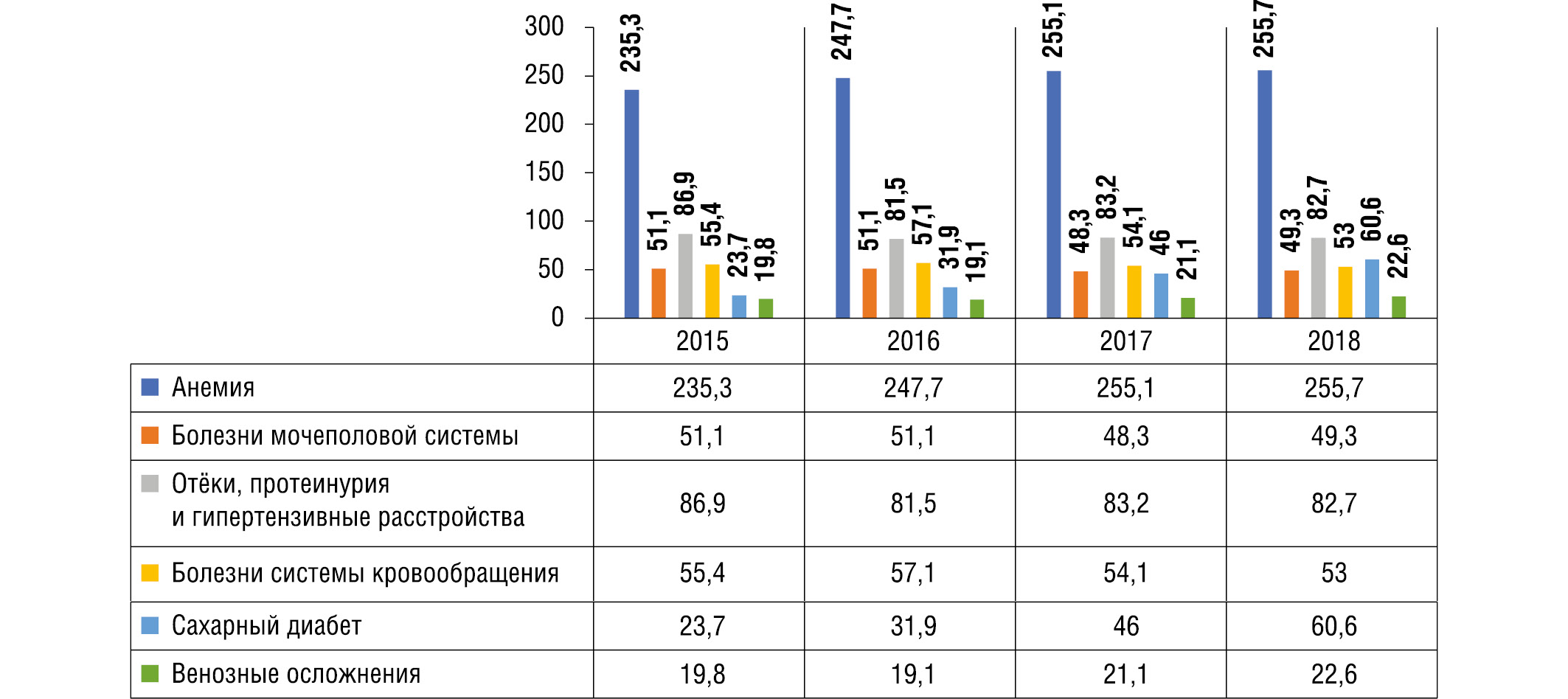 имели осложнения во время беременности 255,7 женщин на 1000 родов. При этом наибольшую долю осложнений составили анемия (35,6%), заболевания мочеполовой системы (16,6%), отёки, протеинурия и гипертензивные расстройства (8,1%), а также болезни системы кровообращения (7,6%) (рис. 5).