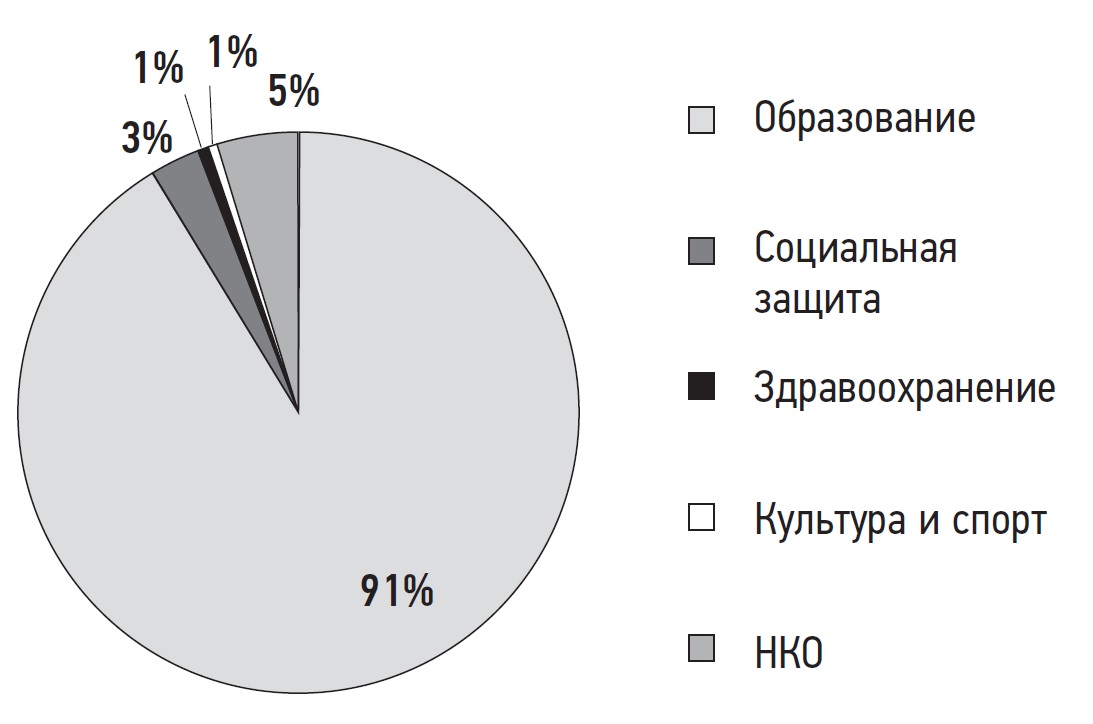 Как было указано ранее, большая часть зарегистрированных на портале ФРЦ организаций находилась в сфере образования. Эти тенденции сохраняются и при распределении по федеральным округам: в сфере образования доля организаций представлена от 82,7 % в Уральском федеральном округе до 98,5 % в Северо-Кавказском федеральном округе; в сфере социальной защиты от отсутствия зарегистрированных организаций в Дальневосточном и Северо-Кавказском федеральных округах до 7,7 % в Уральском федеральном округе; в сфере здравоохранения доля зарегистрированных организаций составляет до 1 %; организации в сфере культуры и спорта представлены в Уральском (0,6 %), Центральном (2,46 %) и Южном (0, 25 %) федеральных округах; доля НКО составляет от 1,5 % в Северо-Кавказском федеральном округе до 7,7 % в Центральном и Уральском федеральном округах (рисунок 4).