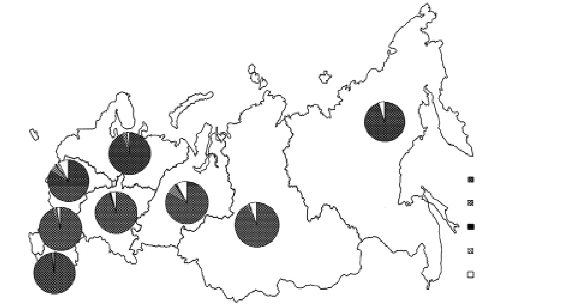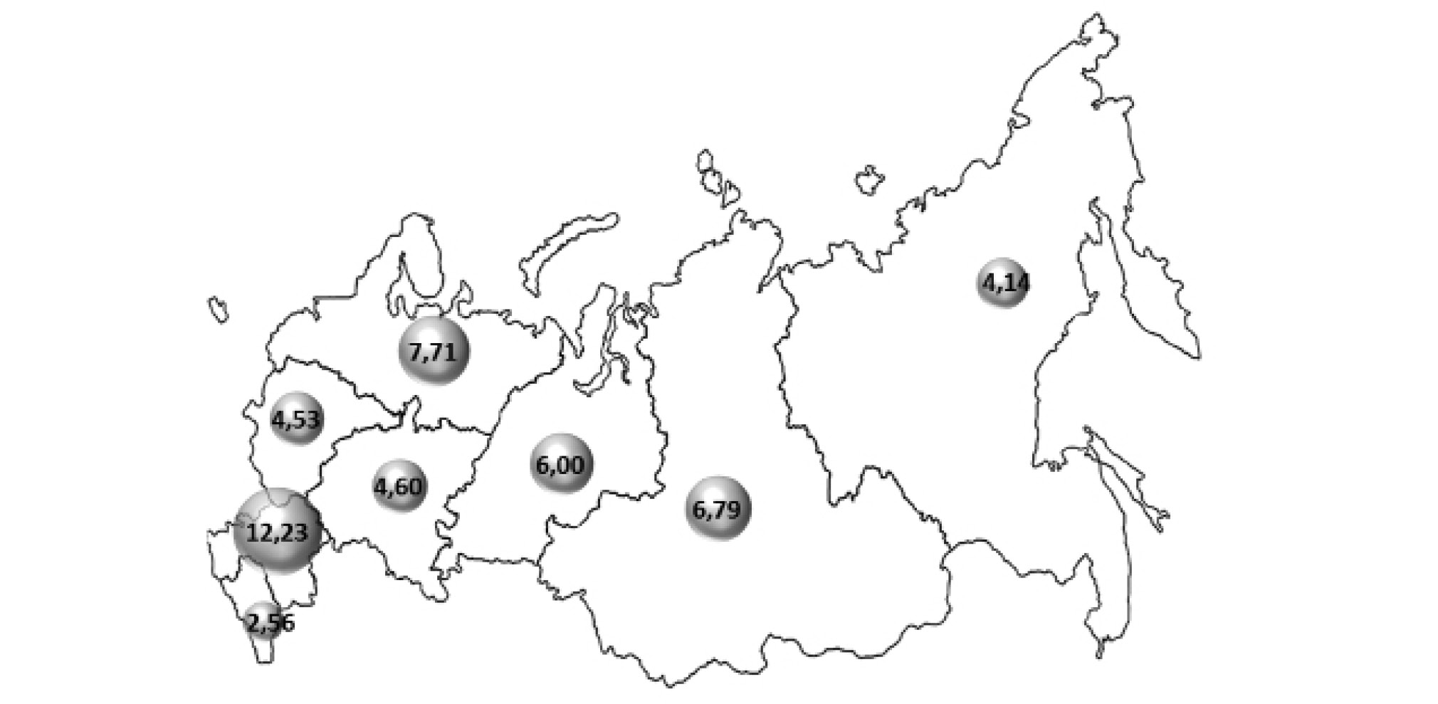 Данные об организациях, предоставленные в ФРЦ от 70 регионов Российской Федерации, сгруппированы нами по федеральным округам: в Южном федеральном округе представлено 22,7 % от общего числа организаций, в Центральном – 18,2 %, в Приволжском – 15,5 %, в Сибирском – 14,5 %, в Северо-Западном – 11,5 %, в Уральском – 9,4 %, в Дальневосточном – 4,4 % и в Северо-Кавказском федеральном округе – 3,8 %.