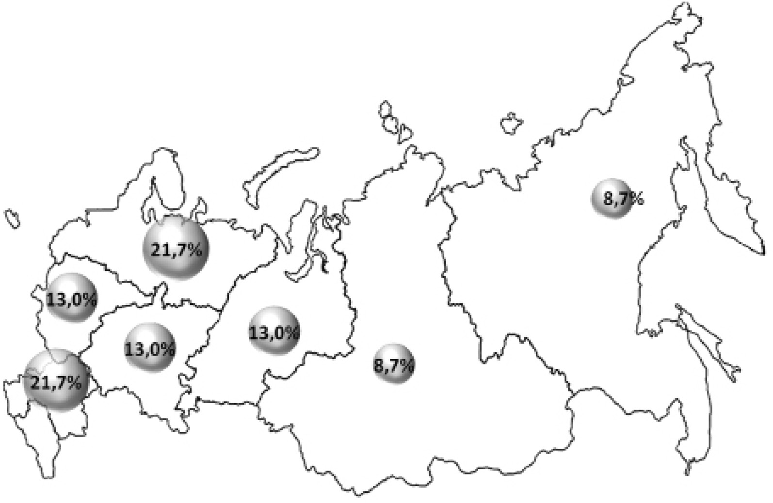 Рис. 5. Распределение региональных ресурсных центров по федеральным округам Российской Федерации.