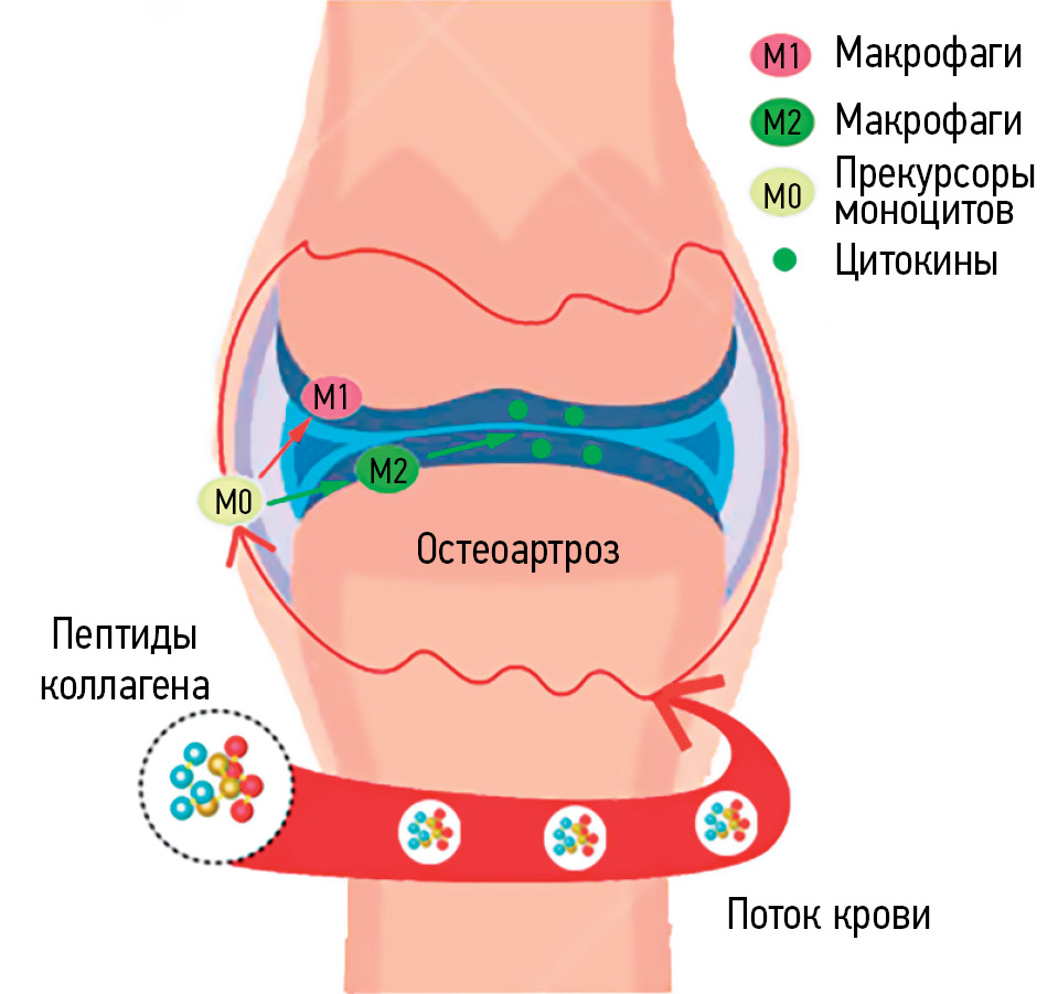 Для производства пищевых добавок на основе гидролизованного коллагена нативный коллаген подвергается денатурации с последующим процессом гидролиза, в результате чего образуются пептиды коллагена с более низкой молекулярной массой (3–6 кДа) по сравнению с размером нативного коллагена (285–300 кДа). В связи с этим пептиды коллагена с более низкой молекулярной массой обладают лучшей биодоступностью, чем неденатурированный коллаген, и с помощью механизма иммунометаболического и фенотипического перепрограммирования макрофагов запускают процессы регенерации хрящевой ткани [15] (рис. 1).