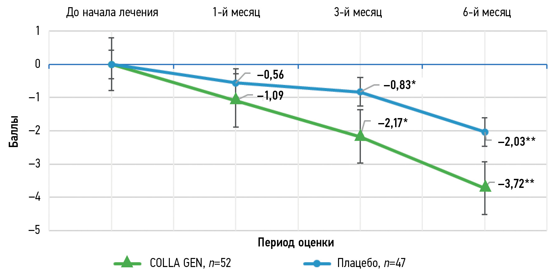 «Первый живой коллаген (COLLA GEN)», n=52 | Плацебо, n=47 | |||||