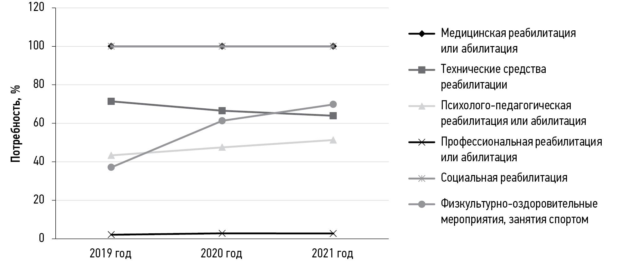Рис. 1. Уровень потребности в реабилитационных мероприятиях детей-инвалидов, проживающих в ДДИ Московской области, за период с 2019 по 2021 г.