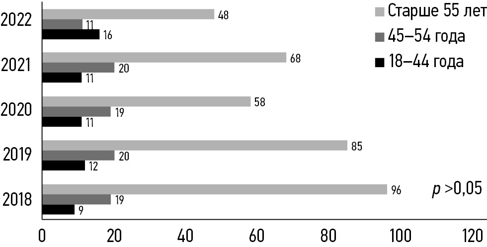 Рис. 1. Число пациенток трёх возрастных групп с раком тела матки, первично признанных инвалидами (2018–2022 гг., p >0,05).