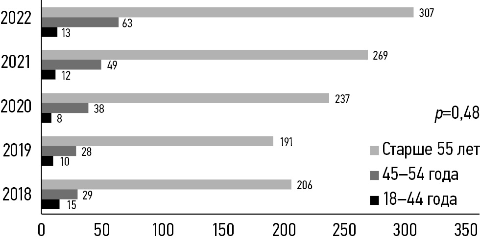 Рис. 2. Число пациенток трёх возрастных групп с раком тела матки, повторно признанных инвалидами (2018–2022 гг., p=0,48).