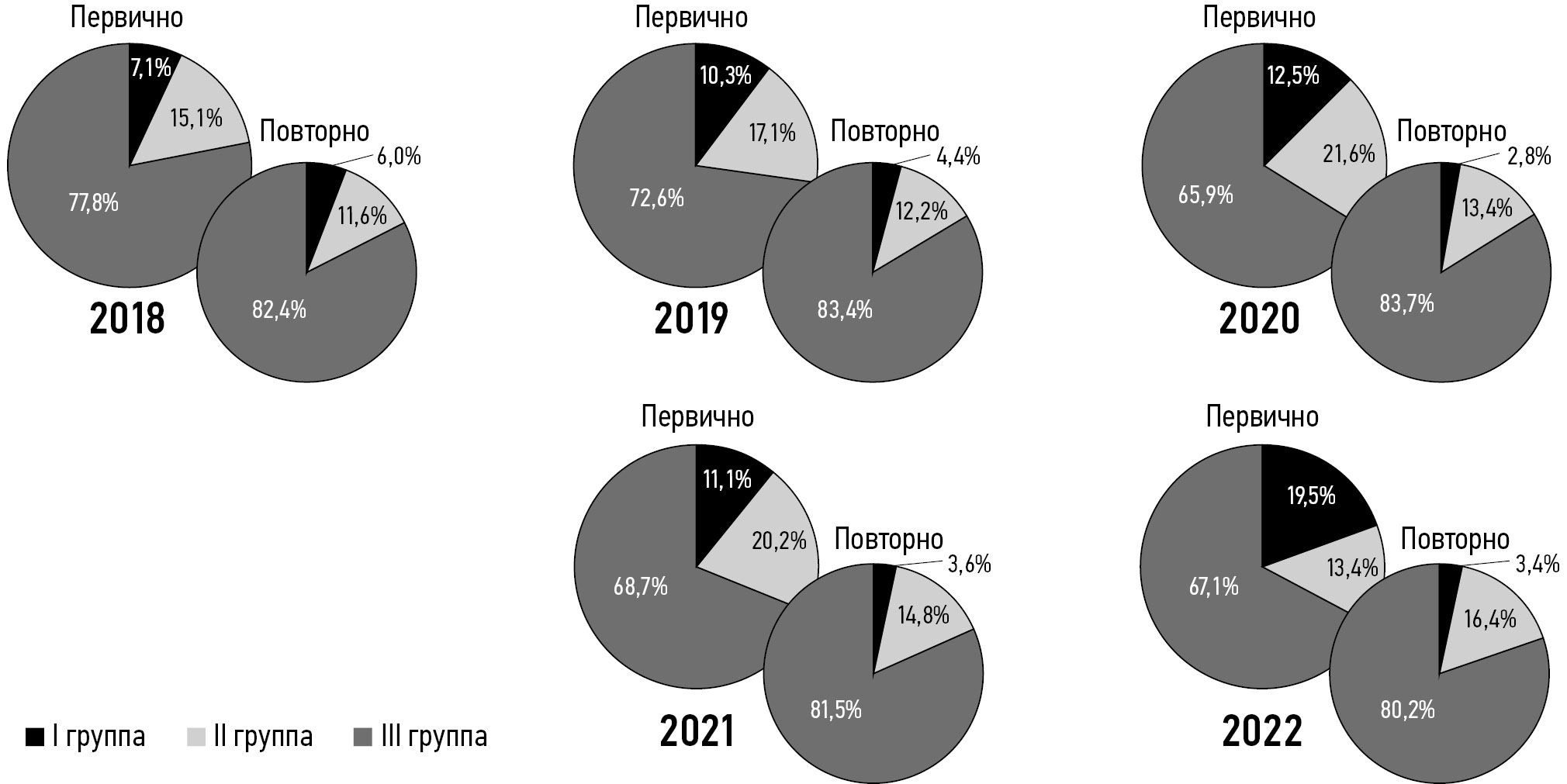 На рис. 3 представлена структура тяжести постоянной нетрудоспособности пациенток за период 2018–2022 гг. Как видно из диаграмм, как среди первично признанных инвалидами, так и в группе повторно освидетельствованных большую часть составляли пациентки с III группой инвалидности.