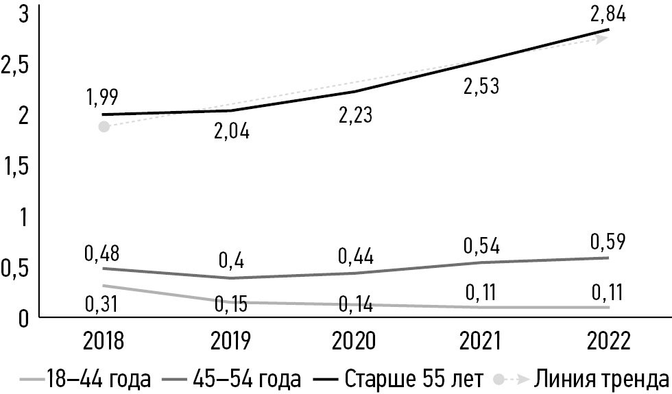Динамика интенсивного показателя уровня инвалидности пациенток с РТМ в течение 2018–2022 гг. (на 10 тыс. женского населения Волгоградской области) представлена на рис. 4. Необходимо отметить чётко прослеживающийся восходящий тренд этого показателя в группе пациенток 55 лет и старше.