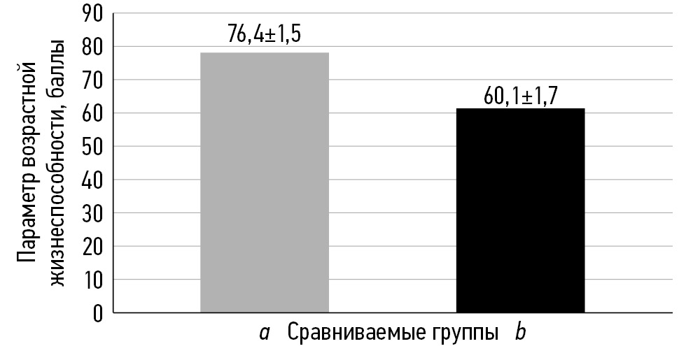 Рис. 1. Различие между пациентами с кортикальной катарактой (a) и первичной открытоугольной глаукомой (b) по величине возрастной жизнеспособности (M±SD, баллы).