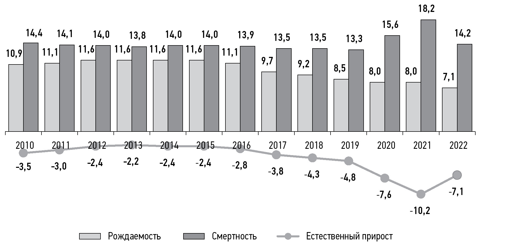 В исходном 2010 г. рождаемость и смертность составили 10,9 и 14,4 на 1000 человек населения соответственно. В изученный период (2010–2022 гг.) население области имеет признаки регрессивности (естественная убыль) вследствие преобладания смертности над рождаемостью. С 2010 г. имеет место снижение коэффициента смертности с 14,4 до 14,2 в 2022 г. (темп прироста -1,4%) и рождаемости с 10,9 до 7,1 на 1000 человек населения (темп прироста -34,9%) (рис. 1).