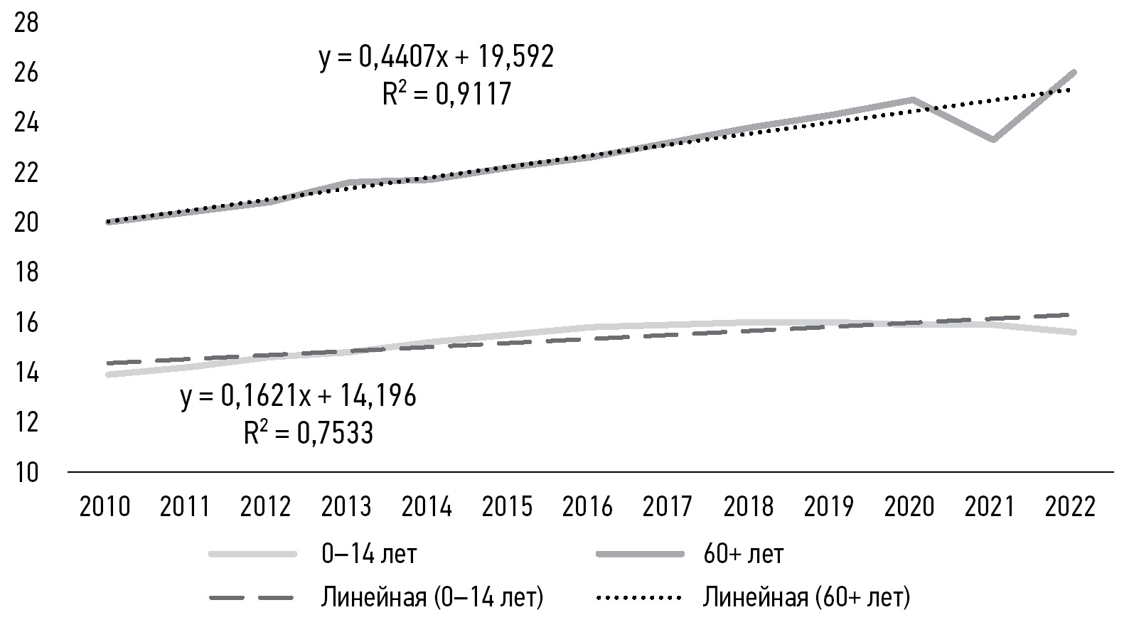 Рис. 2. Доля лиц в возрасте 0–14 и 60 и более лет в общей численности населения Белгородской области, 2010–2022 гг. (на конец года, %).