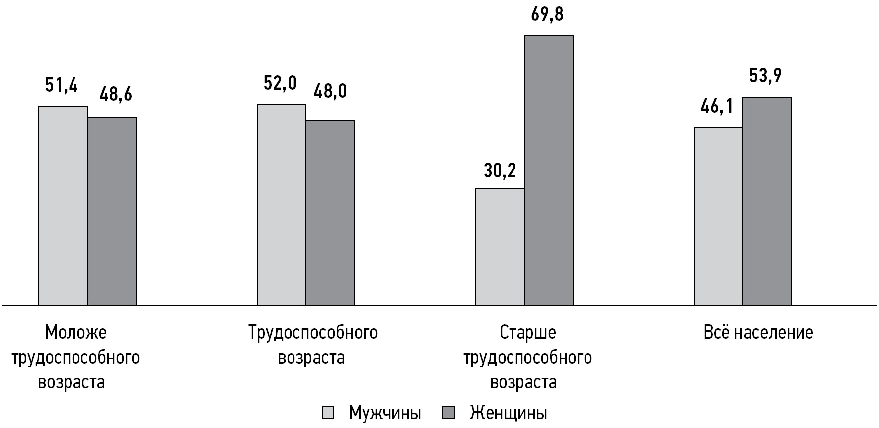 По усреднённым (2010–2022 гг.) данным в структуре населения моложе трудоспособного и трудоспособного возраста незначительно преобладают мужчины (51,4 и 52,0% соответственно) над женщинами (48,6 и 48,0% соответственно). Напротив, среди лиц старше трудоспособного возраста значительно преобладают женщины (69,8%) над мужчинами (30,2%) (рис. 3).