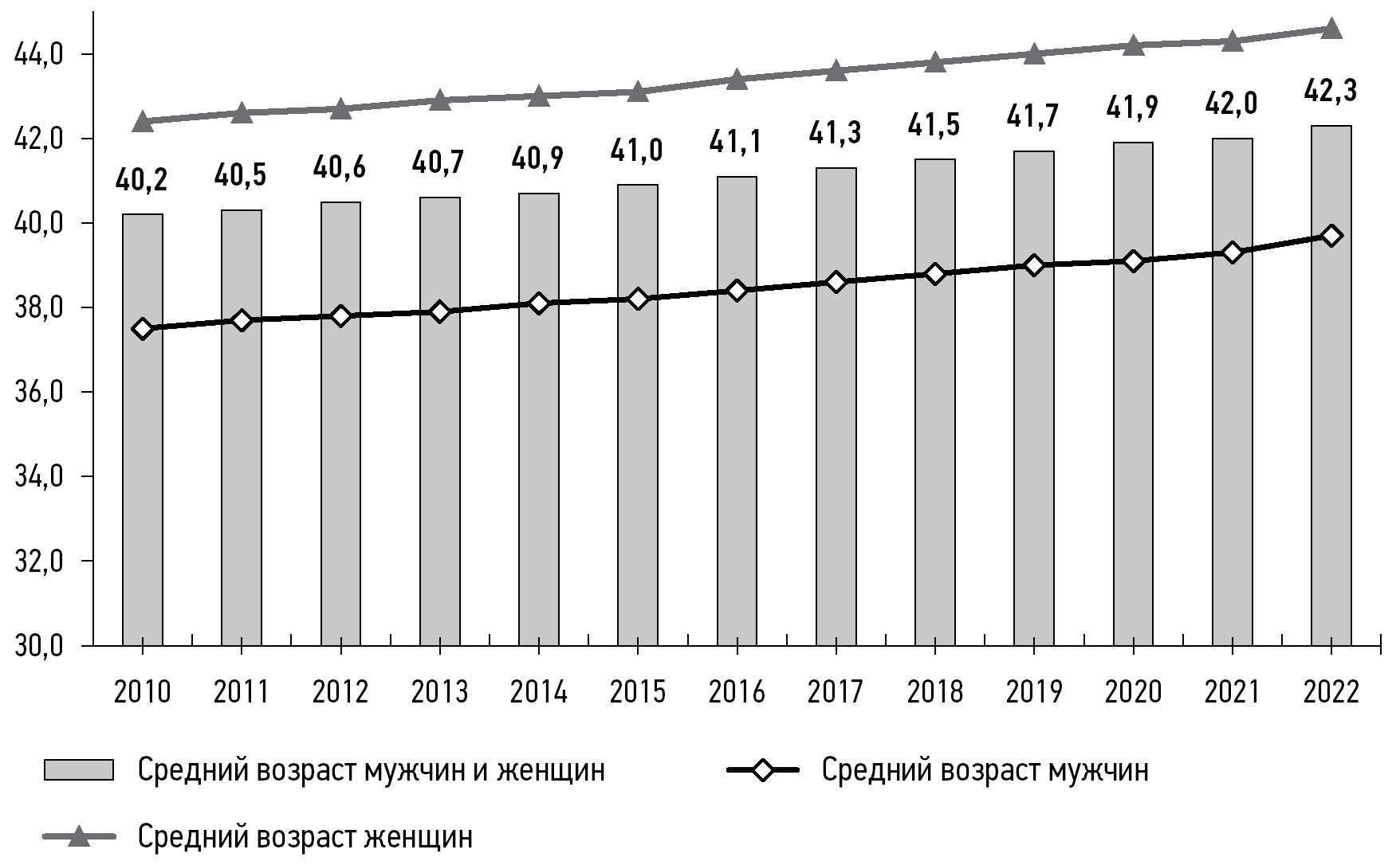 С 2010 по 2022 г. средний возраст населения увеличился с 40,2 до 42,3 года (прирост +5,2%), в том числе мужчин — с 37,5 до 39,7 года (прирост +5,9%) и женщин — с 42,4 до 44,6 года (прирост +5,2%) (рис. 4).