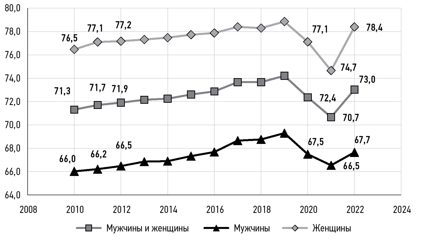 С 2010 по 2022 г. ожидаемая продолжительность жизни населения увеличилась с 71,3 до 73,0 года (прирост +1,7 лет), в том числе мужчин — с 66,0 до 67,7 года (прирост +1,7 года) и женщин — с 76,5 до 78,4 года (прирост +1,9 года) (рис. 5).