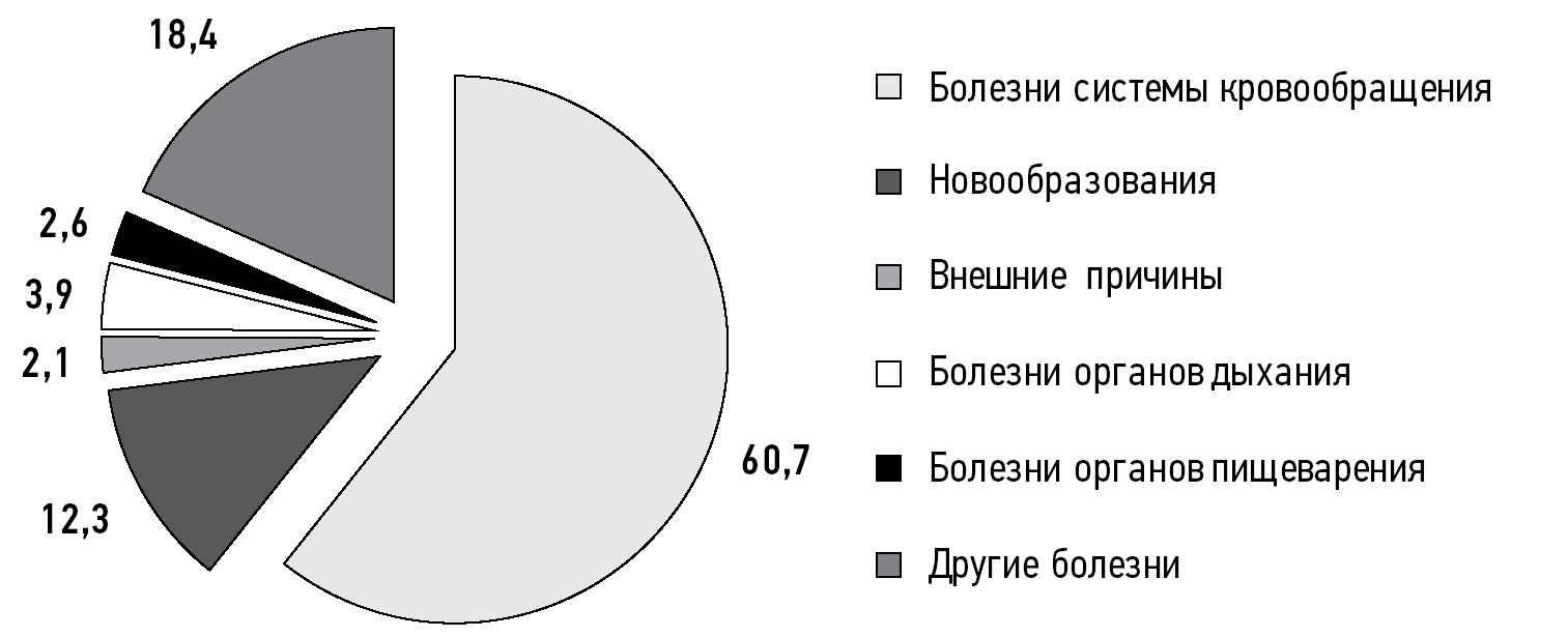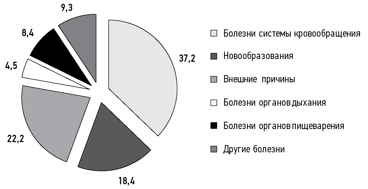 Основными причинами смерти населения старше трудоспособного возраста Белгородской области в среднем за исследуемый период являлись болезни системы кровообращения (60,7%) и новообразования (12,3%) — на их долю приходится порядка 73,0% всех случаев смерти; менее значима доля болезней органов дыхания, пищеварения и внешних причин (3,9, 2,6 и 2,1% соответственно). У лиц трудоспособного возраста основными причинами смерти являются болезни системы кровообращения (37,2%), внешние причины (22,2%), новообразования (18,4%) и болезни органов пищеварения (8,4%) — на их долю приходится порядка 86,2% всех случаев смерти, доля болезней органов дыхания составила 4,5% (рис. 6, 7).