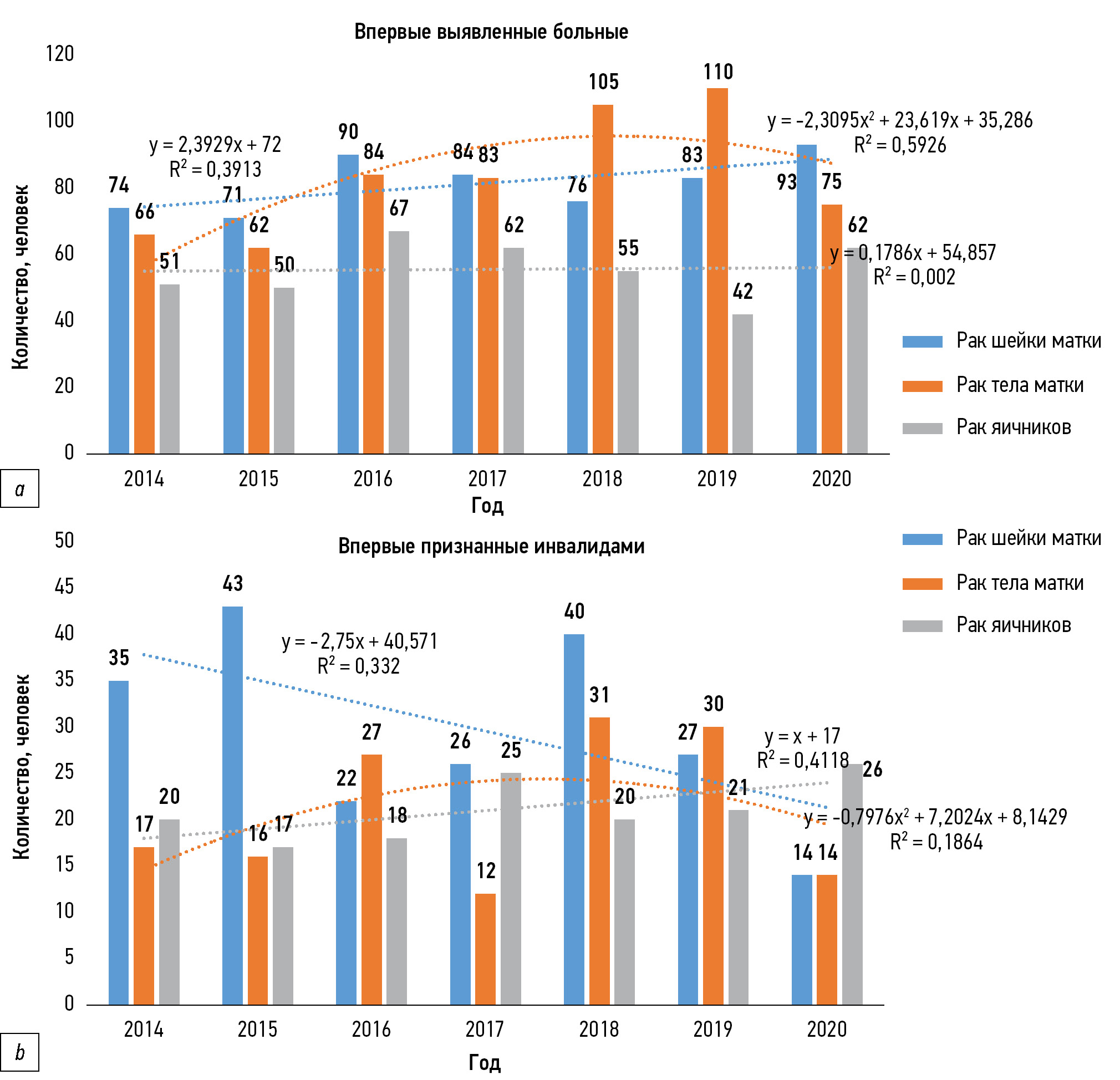 Оценка характера зависимости значений заболеваемости и инвалидности в динамике выявила следующее (рис. 1). Динамика численности больных (рис. 1a) в контингенте впервые выявленных больных раком шейки матки (РШМ) демонстрировала рост в 2016 г., затем уменьшение в 2017–2018 гг. и вновь рост в 2019–2020 гг. (R2=0,391). В контингенте больных раком тела матки (РТМ) отмечался рост в 2016–2019 гг., а в 2020 г. имело место уменьшение (R2=0,593). В контингенте больных раком яичников (РЯ) отмечалось волнообразное изменение с максимальным значением в 2016 г., уменьшением в последующем и вновь ростом в 2020 г. (R2=0,002).