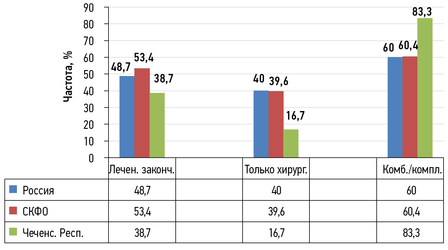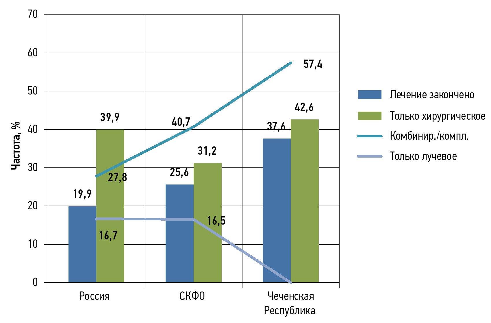 При всех стадиях РЯ выполнялось радикальное хирургическое лечение — экстирпация матки с придатками, удаление большого сальника и ревизия органов брюшной полости и малого таза для определения. Проводились стадирование, выявление метастатических очагов и последующая лимфаденэктомия. При отсутствии условий для осуществления радикального оперативного вмешательства (в случаях, когда препятствуют объёмы и распространённость опухоли) проводились неоадъювантная химиотерапия для циторедукции и последующее оперативное пособие. В Чеченской Республике лечение РЯ, впервые зарегистрированного в 2020 г. и подлежащего радикальному лечению, было закончено в 2020 г. у 24 больных (в СКФО — у 336 больных, в целом по России — у 6058), доля от впервые выявленных больных составила 38,7% (в СКФО — 53,4%, в целом по России — 48,7%) (рис. 4). Лечение не было закончено и подлежало продолжению у 20 больных (в СКФО — у 154, в целом по России — у 2597), доля от впервые выявленных больных составила 32,3% (в СКФО — 24,5%, в целом по России — 20,9%), в том числе с использованием только хирургического метода лечения — 16,7% (в СКФО — 39,6%, в целом по России — 40,0%), комбинированного или комплексного (кроме химиолучевого) — 83,3% (в СКФО — 60,4%, в целом по России — 60,0%).