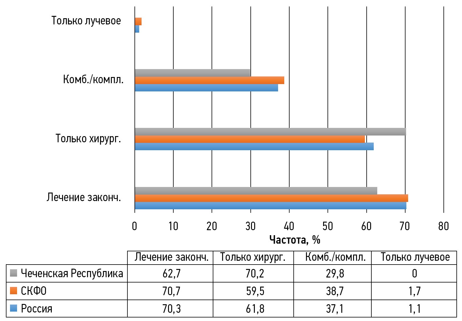 Основным подходом к лечению независимо от стадии РТМ являлось радикальное хирургическое вмешательство, проводимое как самостоятельно, так и в комбинации с другими методами, в том числе при реализованной фертильной функции, опухолях с метастазами вне шейки и тела матки (за исключением лимфоузлов) и сочетанной патологии. В Чеченской Республике лечение РТМ, впервые зарегистрированного в 2020 г. и подлежащего радикальному лечению, закончено в 2020 г. у 47 больных (в СКФО — у 630 больных, в целом по России — у 16 411 больных), доля от впервые выявленных больных составила 62,7% (в СКФО — 70,7%, в целом по России — 70,3%) (рис. 3). Лечение не было закончено и подлежало продолжению у 14 больных (в СКФО — у 116 больных, в целом по России — у 311 больных), доля от впервые выявленных больных составила 18,7% (в СКФО — 13,0%, в целом по России — 13,3%), в том числе с использованием следующих методов лечения: только хирургического — 70,2% (в СКФО — 59,5%, в целом по России — 61,8%), комбинированного или комплексного (кроме химиолучевого) — 29,8% (в СКФО — 38,7%, в целом по России — 37,1%). Только лучевой метод лечения в Чеченской Республике не применялся (в СКФО был применён у 1,7% больных, в целом по России — у 1,1% больных).