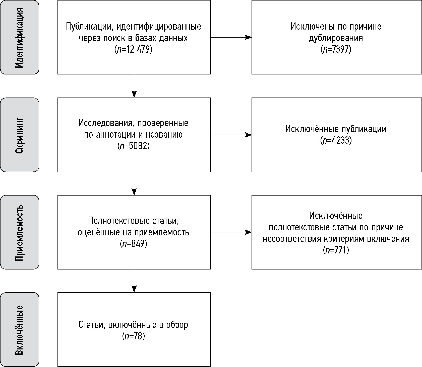 В результате поиска в анализ было включено 78 публикаций, отражающих наиболее значимые и актуальные данные по теме.