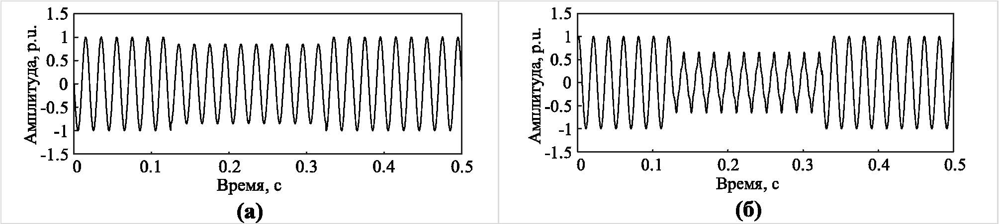 Рис. 8. Результаты обнаружения провала напряжения при наличии шума (а) и гармоник (б) методом RMS