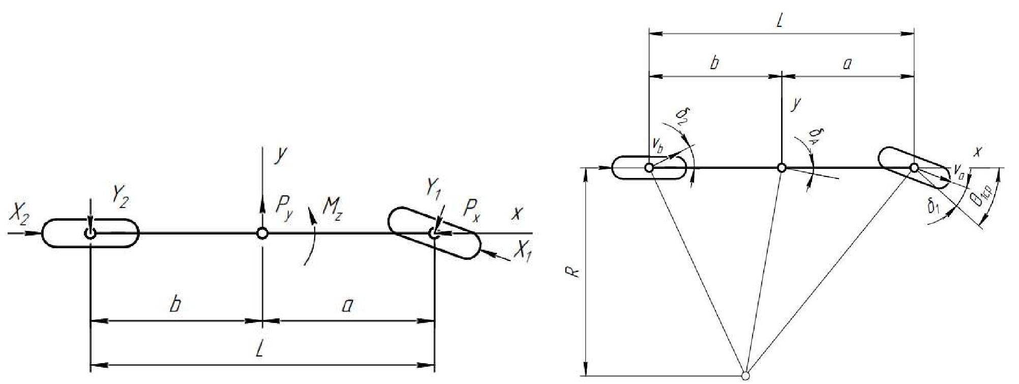 Для первоначального анализа был выбран математический аппарат, разработанный А.С. Литвиновым [6]. Движение двухосного автомобиля с передней управляемой и обеими ведущими осями он описывает двумя дифференциальными уравнениями: