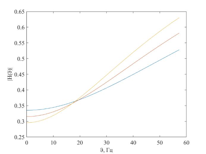 Рис. 3.3. АЧХ для различных масс заднеприводного автомобиля: синий – 12220 кг, красный – 15510 кг, желтый – 18800 кг