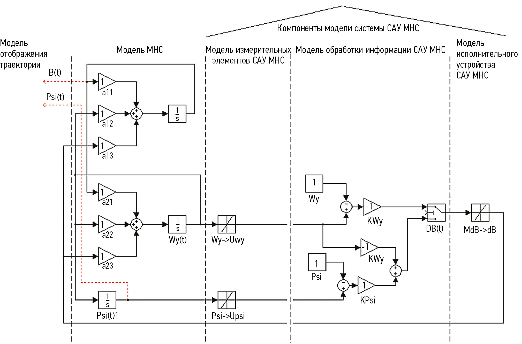 Для начала исследования системы управления движением БК требуется указать линейные функции управления БК (табл. 1). Затем на основе полученных расчетов нужно построить структурную схему моделирования управляемого движения БК с использованием линейных функций (рис. 4).
