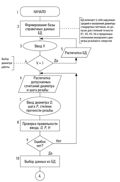 Рис. 2. Блок-схема алгоритма расчета комбинированного инструмента зенкер-метчик. БД ― база данных; D диаметр; Р шаг резьбы; Н степень прочности.